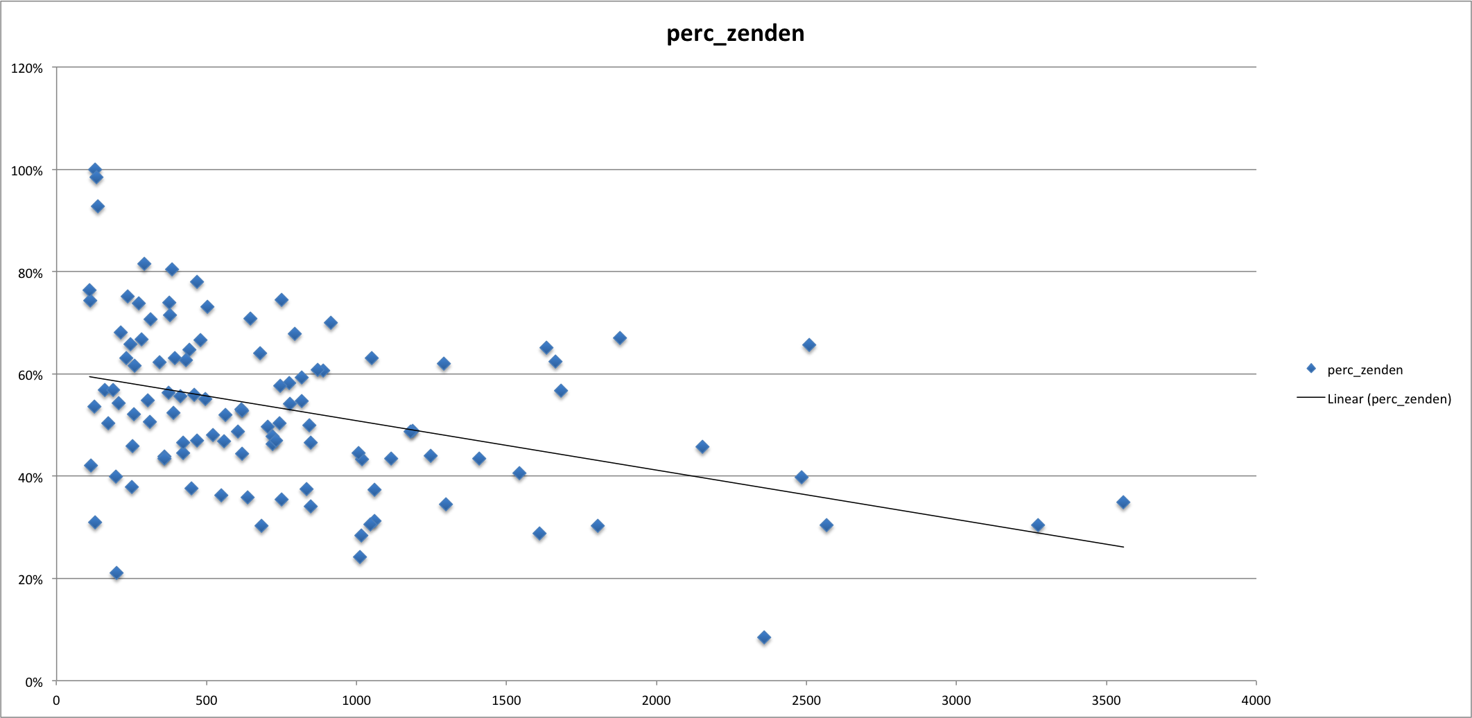Als laatste kijken we naar de relatie tussen de activiteit van een Kamerlid op Twitter en het percentage tweets dat dit Kamerlid aan een persoon richt. Onderstaande afbeelding toont aan dat er een relatie is: hoe actiever een Kamerlid is op Twitter, hoe vaker het Kamerlid Twitter ook gebruikt om in gesprek te gaan met de kiezer (in percentage van de tweets met een @-mention).