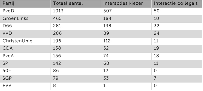 We zien dat in de maand voor de verkiezingen de PvdD de partij was die het meest actief was op Twitter met gemiddeld 1.013 tweets per kandidaat. Toegegeven, er zijn maar twee Kamerleden van de PvdD, waardoor de kans op uitschieters groot is. Het gemiddelde van GroenLinks is ook noemenswaardig hoog. Opvallend is dat de PVV-fractie in de verkiezingsperiode gemiddeld acht tweets per persoon plaatst, waarvan gemiddeld één tweet interactie is met de kiezer (een @-mention).