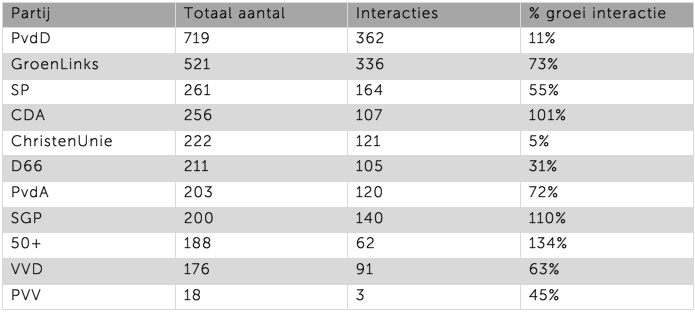 Gemiddeld over alle Kamerleden is de hoeveelheid interactie op Twitter gestegen ten opzichte van de verkiezingsperiode (toen was het 45%, nu is het 55%, waarvan in beide gevallen 10% interactie is met een collega-Kamerlid). Kortom, gemiddeld gebruiken de Kamerleden Twitter steeds meer als middel voor interactie met de kiezer.