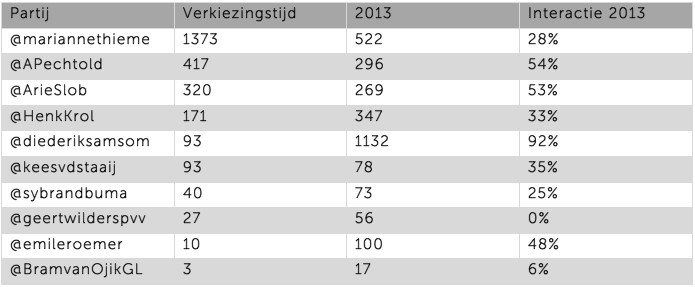 Deze analyse is uitgevoerd samen met Martijn Kriens, aan de hand van data vanuit Coosto. Er is gekeken naar de huidige Tweede Kamer-leden. Er is alleen gekeken naar Twitter, veruit het meest gebruikte sociale medium van de huidige Tweede Kamer-leden. Van de 150 Kamerleden hebben 137 een Twitteraccount (7 PVV’ers, 3 SP’ers, 2 VVD’ers en 1 PvdA’er hebben geen Twitteraccount). Van deze 137 hebben acht Kamerleden tijdens verkiezingstijd niet getwitterd. In dit onderzoek is de data tijdens de verkiezingen (12 augustus 2012 – 12 september 2012) vergeleken met de afgelopen twee maanden (begin januari 2013 – nu).