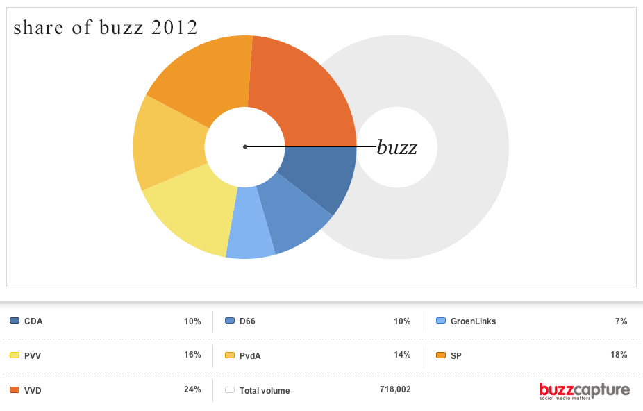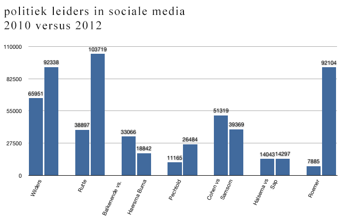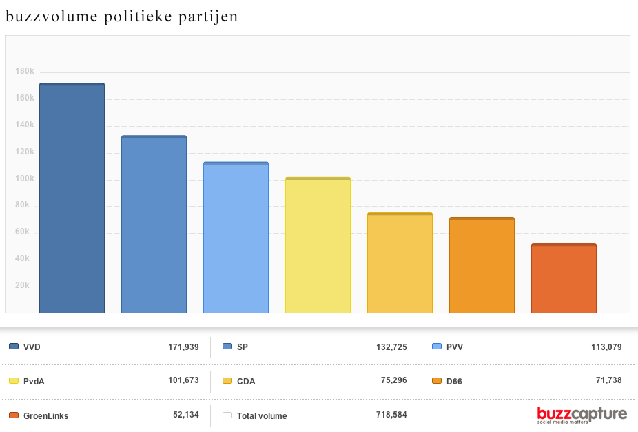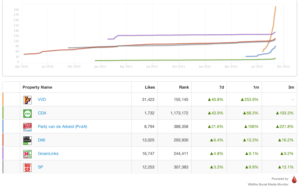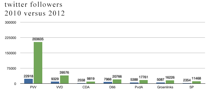 Ondanks dat het echte gesprek wordt vermeden zijn burgers bereid een partij te volgen en politieke voorkeur aan te geven. Via netwerken als Twitter en Facebook blijven zij maar al te graag op de hoogte van de laatste ontwikkelingen. Net als in 2010 kan Geert Wilders rekenen op de grootste groep volgers. De afgelopen twee jaar groeide deze groep met maar liefst 788% naar ruim 200.000 volgers. Relatief volgen de SP (+387%) en VVD (+324%) op grote afstand.