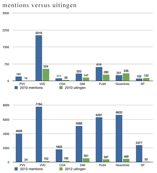 Het in kaart brengen van de betrokkenheid is lastig maar een poging waard. In het symplistische geval dat alle mentions aan een partijaccount een directe vraag of opmerking betreft waren dit er in de weken voor de verkiezingen van 2010 enkele honderden per partij tot aan 2000 voor de VVD. In deze eenvoudig geschetste situatie zijn alle uitingen van de partijen zelf reacties of pogingen om te verbinden. Zowel de SP als Groenlinks plaatste meer uitingen dan zij mentions ontvingen.