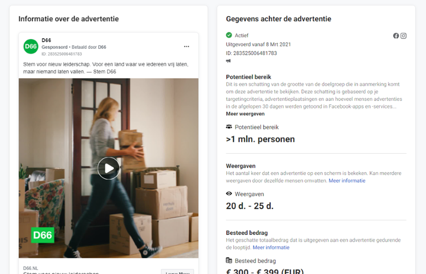 Informatiepagina van een D66-advertentie op Facebooks Ad Library