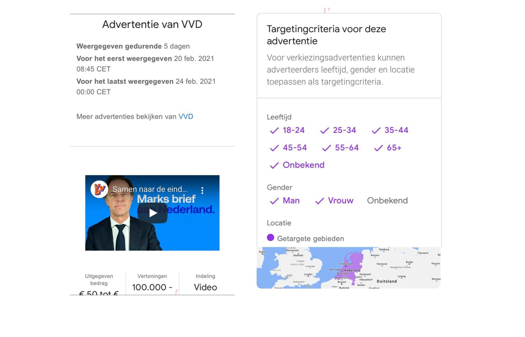 Via het Google Transparency Report biedt Google kiezers de mogelijkheid te navigeren door alle gegevens van politieke advertenties die via Google’s netwerk (Google zelf, YouTube en partnersites) worden vertoond. Via deze pagina kun je een selectie maken op basis van land, periode, adverteerder, type advertentie (video, beeld of tekst) en het bereik/mediabudget van de advertentie. Vervolgens wordt per advertentie aangegeven: hoe lang de advertentie is weergegeven, welke content wordt gebruikt en informatie over de targeting op basis van demografie en geografie. Een voorbeeld kun je hier vinden.