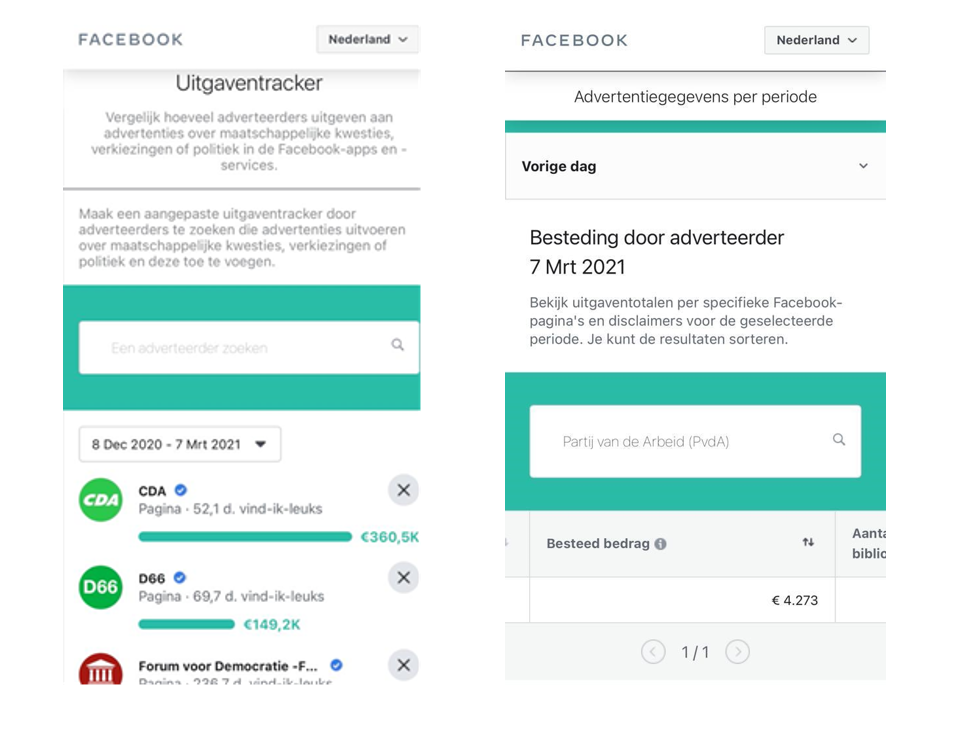 Via de bibliotheek kun je ook overzichten bekijken van alle uitgaven die politieke partijen doen aan online advertising. Hier is per pagina te zien hoeveel is besteed in specifieke perioden. Je kunt daarnaast ook opsplitsingen maken per locatie. Wil je een compleet overzicht zien, dan kun je alle resultaten downloaden in een ruw Excel-bestand (CSV).