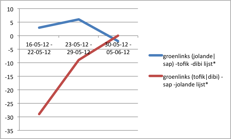 Als we kijken naar de paar weken voor 6 juni (uitslag van de lijsttrekkersverkiezing GroenLinks) dan zien we dat berichten die wel Jolande Sap maar niet Tofik Dibi melden en andersom beginnen met zeer negatief over Tofik Dibi en licht positief over Jolande Sap. In deze beginperiode zijn ook de meeste berichten geplaatst. Aangezien het vrij snel duidelijk was dat Tofik Dibi geen kans had, zag je dat de inhoud van de berichten al snel meer gingen over de schade voor GroenLinks dan over de vraag wie de lijstrekker zou worden; er waren bijvoorbeeld nauwelijks berichten in de trant van “ik stem voor …”. Gemiddeld stond Jolande Sap op een sentiment van 7 en Tofik Dibi op een sentiment van -38. Het is duidelijk dat dit een goede indicatie was voor de overwinning met 'bijna Oost-Europese cijfers' voor Jolande Sap. Echter, ik denk dat, omdat de discussie op de sociale media eigenlijk al niet meer over de verkiezing ging, ik me niet aan een voorspelling over percentages zou hebben gewaagd (kan ik nu veilig zeggen).