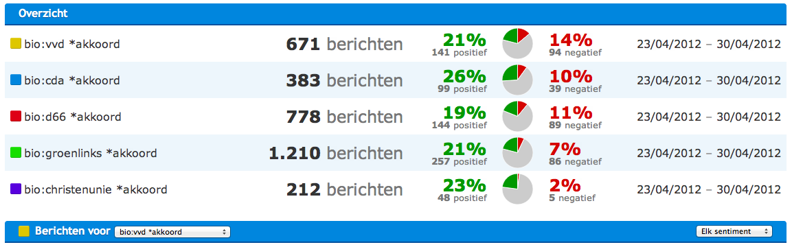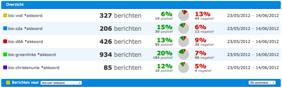 Kijken we naar de berichten sinds 23 mei, dan zien we dat er wel wat veranderd is. Het enthousiasme binnen de VDD is danig bekoeld van 21% naar 6% positief met een gelijkblijvend negatief percentage. Ook de overige partijen zijn, hoewel minder, flink gezakt in positivisme, behalve GroenLinks die onverminderd positief zijn. In de tweets is ook te zien dat GroenLinks zichzelf ziet als belangrijke architect van dit akkoord en het als inzet ziet voor de verkiezingen. Bij de andere partijen speelt dat minder.
