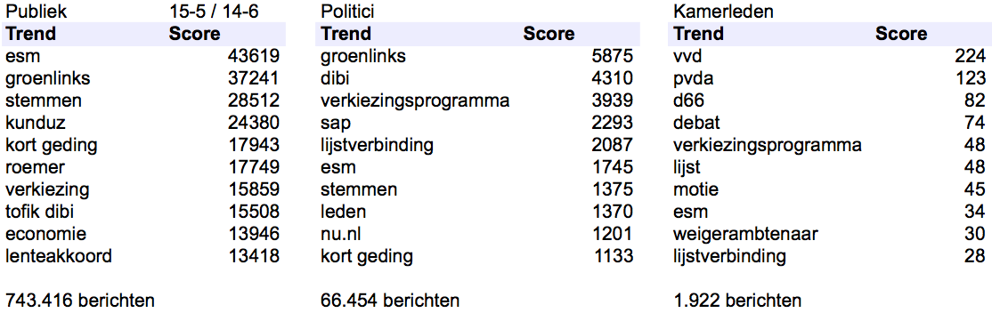 Hierboven zien we de topic clouds van de onderwerpen waarover achereenvolgens het algemene publiek, de politieke leden en de Kamerleden praten. Daaronder staat de tabel met de onderwerpen en hoe vaak ze voorkomen. Opvallend is dat het algemene publiek het ESM (het noodfonds dat Spanje moet gaan steunen) ver bovenaan zet terwijl dit bij de politiek geïnteresseerden pas op de 6e plaats komt en bij de Kamerleden pas op de 8e plaats.