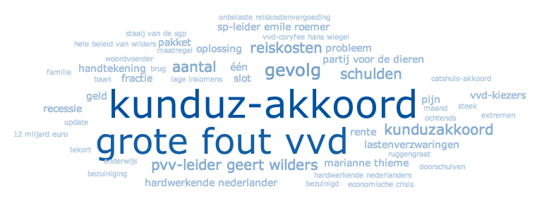 Als we kijken naar de mening van het algemene publiek over het akkoord dan zien we dat de mening met 9% positief en 20% negatief overwegend negatief is. De onderwerpen die het algemene publiek noemt als negatief zijn onder andere: “grote fout VVD”, reiskosten, hardwerkende Nederlanders en uiteraard Geert Wilders.