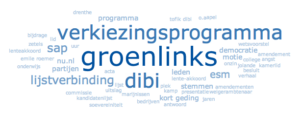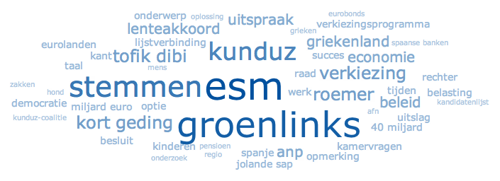 Als we kijken naar de onderwerpen die Kamerleden noemen, valt op dat de eerste drie onderwerpen politieke partijen zelf zijn en alleen het ESM en de “weigerambtenaar” als onderwerpen in de top10 staan die niet over het politieke spel zelf gaan. Topics als debat, verkiezingsprogramma, lijst, motie, lijstverbinding zijn natuurlijk erg interne, politiek onderwerpen. Dat duidt toch wel op een zeker kaasstolpgehalte!
