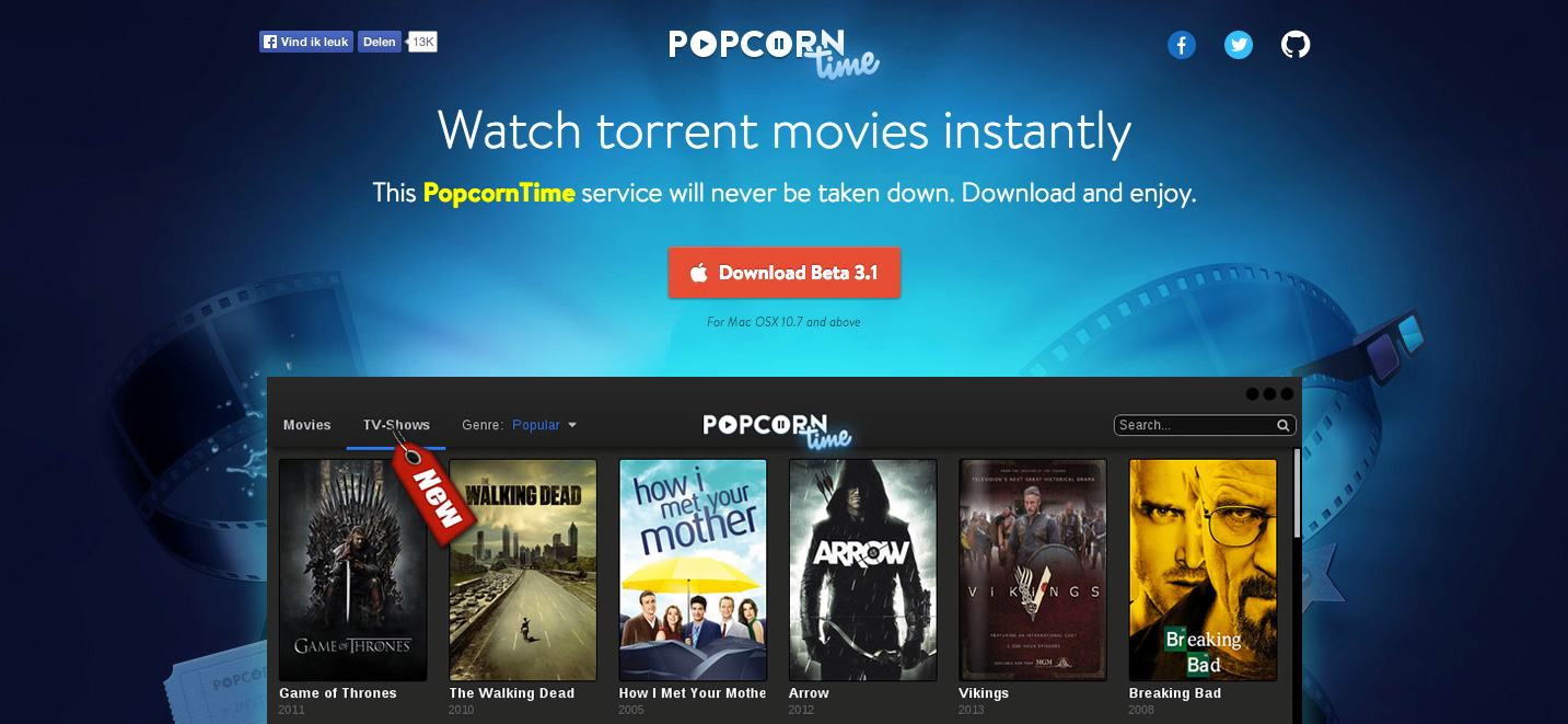 Op 11 maart lanceerde een groep ontwikkelaars uit Buenos Aires het programma Popcorn Time. Een applicatie die het bekijken van illegale films en series doodsimpel maakt. Dankzij een gebruiksvriendelijke interface, die sterk doet denken aan die van Netflix, is het mogelijk om bittorrent-bestanden direct te bekijken. Niet langer moet je wachten totdat een bittorrent volledig is gedownload, maar door simpelweg op de afbeelding van een film te klikken, wordt na 30 seconden bufferen de film getoond. Je hoeft zelfs niet meer op zoek te gaan naar een bijpassende ondertitel. Ook dit regelt de software automatisch. Een cursus bittorrent is niet meer vereist, zó simpel is Popcorn Time. Een kind kan de was doen.