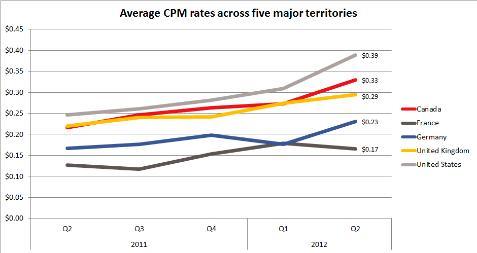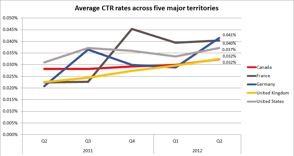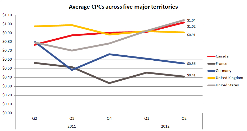 De kosten per klik in de landen Amerika en Canada zijn voor het eerst boven de $1 grens gestegen. Een stijging van 13 procent. De Europese landen Duitsland, Verenigd Koninkrijk en Frankrijk laten daarentegen een daling zien in kosten per klik. In het algemeen stijgen de kosten per klik met 9 procent na de daling van maar liefst 23 procent in het eerste kwartaal van 2012.