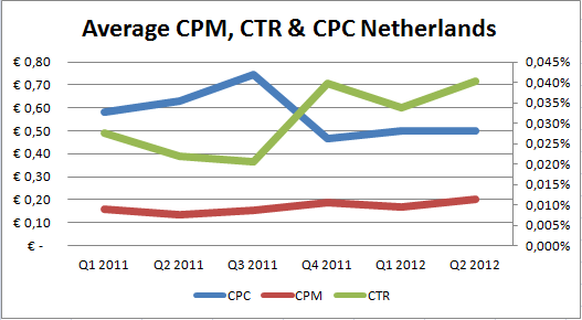 De internationale trends met betrekking tot de kosten per klik of vertoning en het doorklikpercentage zijn ook zichtbaar in Nederland. De CTR over Q2 laat een stijging van 19 procent ten opzichte van Q1. Ook de CPM laat een lichte stijging zien (+20 procent). Daarnaast blijven de kosten per klik over Q2 in vergelijking met Q1 2012 vrijwel gelijk. Deze cijfers zijn gebaseerd op 2 miljard impressies van campagnes, opgezet en gemanaged door StormMC. Deze campagnes waren alleen gericht op Nederland.