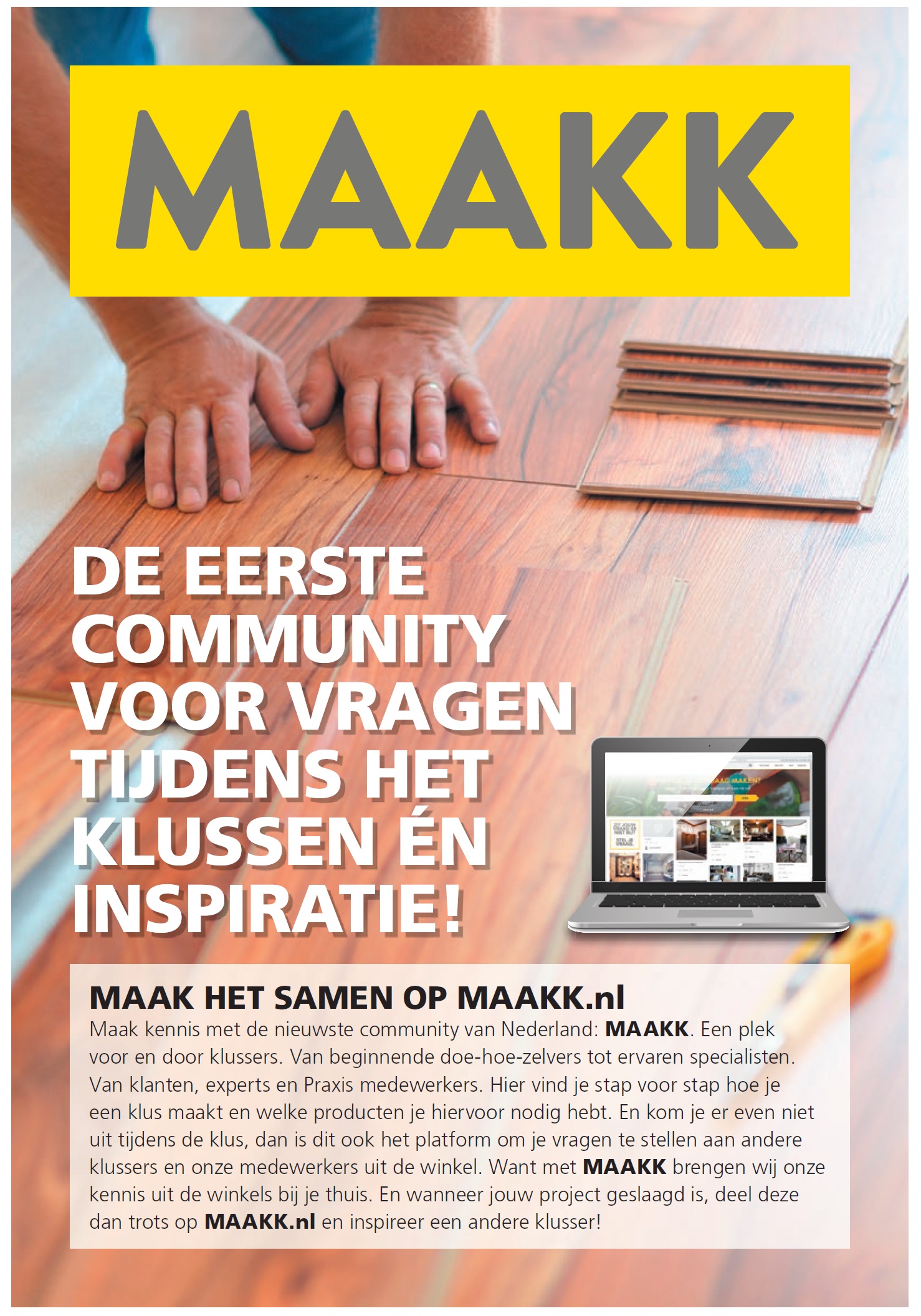 “Wij snappen dat een klus al eens gedaan moet zijn voordat iemand ook echt weet hoe iets moet worden uitgevoerd. Klussers die al eens met een specifiek bijltje hebben gehakt, kunnen op Maakk.nl anderen helpen met foto’s van de klus, een omschrijving van bijvoorbeeld de kosten en de duur van het project, welk gereedschap er gebruikt is en welke artikelen je nodig hebt. Het ‘boodschappenlijstje’ met artikelen dat hieruit ontstaat, is gekoppeld aan onze webwinkel, zodat je de producten direct online kunt bestellen. Deze functie moet nu nog worden uitgebreid, maar zal straks vergelijkbaar zijn met Appie van Albert Heijn. Alle gevonden producten op Maakk.nl verzamel je straks in één basket op Praxis.nl.”