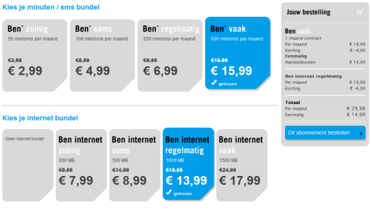 Wat overzichtelijkheid betreft, geeft Ben het beste voorbeeld in de branche. In ons onderzoek behaalt Ben.nl de eerste plaats op de onderdelen Eerste Indruk en Vormgeving. “Ben heeft een overzichtelijke homepage, niet te veel informatie en geeft aanbiedingen overzichtelijk weer”, aldus een respondent. Het laatste screenshot hieronder maakt alles duidelijk: de tarieven staan levensgroot in beeld en kleuren vrolijk op wanneer geselecteerd. Ben zakt op de ranglijst vanwege een verminderde online vindbaarheid, maar weet nog steeds relatief veel bezoekers te overtuigen.