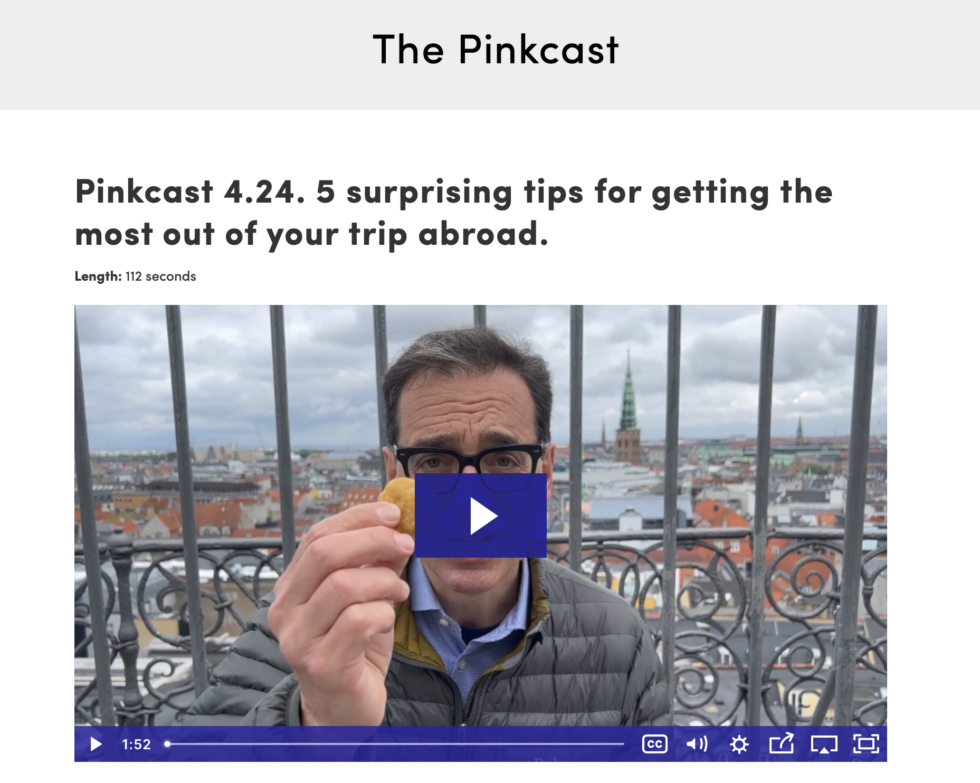 Daniel Pink kent iedereen waarschijnlijk wel van zijn boeken of TED talks. Daniel maakt iedere twee weken een ‘pinkcast’. Een twee minuten durende video gebaseerd op een wetenschappelijk inzicht. Heerlijk korte verhaaltjes met mooie en handige inzichtjes. Zoals deze over de top 5 die je moet doen als je op vakantie bent in een ander land of stad.