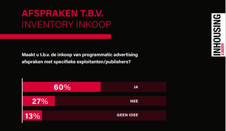 Programmatic advertising is voor veel adverteerders een vast onderdeel van de digitale mediamix, maar het in-house brengen is vaak een grotere stap dan bij bijvoorbeeld search of social. Naast campagnemanagement en -optimalisatie zijn ook kennis van het medialandschap en mediabuying noodzakelijk. Dat er nog veel te winnen valt op dit vlak is duidelijk: 27 procent van de adverteerders maakt geen afspraken met specifieke publishers en 13 procent weet überhaupt niet of er deals worden gemaakt.