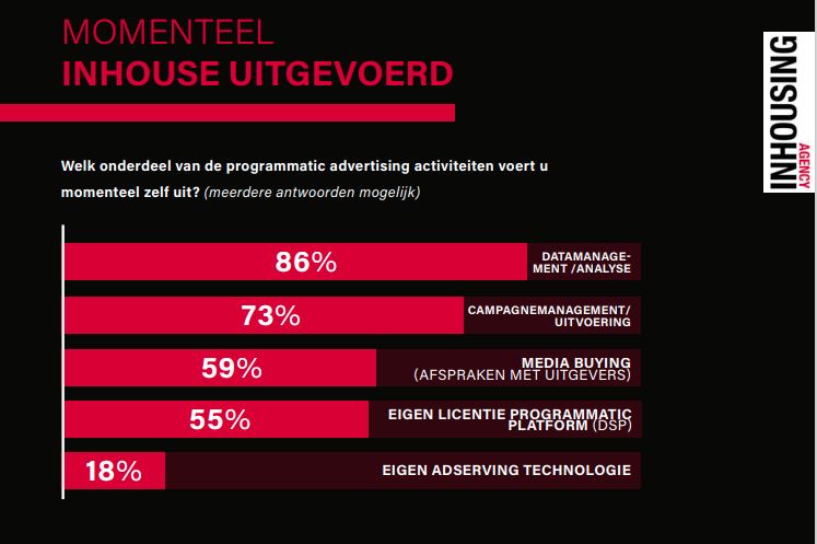 Het klassieke model tussen adverteerders en bureaus is langzaam aan het verschuiven. Waar eerder de uitvoering van programmatic advertising aan bureauzijde lag, nemen steeds vaker adverteerders het heft in handen en brengen programmatic advertising in-house. Van de partijen die beschikken over een dedicated digital team (in-house) of via een hybride model werkzaam zijn geeft ruim 86 procent aan dat zij datamanagement en analyse zelf uitvoeren. Daarnaast doet ruim 70 procent zelf de uitvoer van het campagnemanagement.