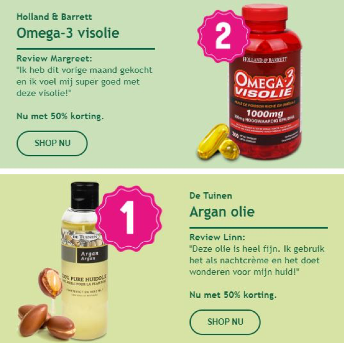 Voorbeeld van sociale bewijskracht: Holland & Barrett stuurde alle klanten een e-mail met daarin vijf producten die door de klanten zelf werden beoordeeld met minstens 4,5 van de 5 sterren. Bij ieder product werd ook een review getoond.