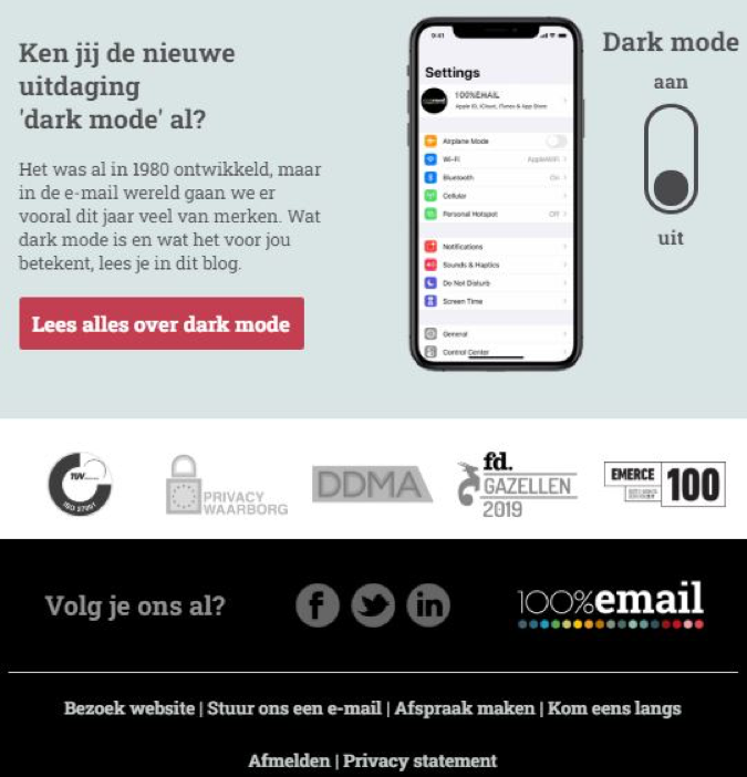 Voorbeeld van autoriteit: bij 100%EMAIL gebruiken wij in onze eigen nieuwsbrieven altijd logo’s van gewonnen prijzen, om te benadrukken dat we de kennis en kunde in huis hebben over e-mailmarketing.