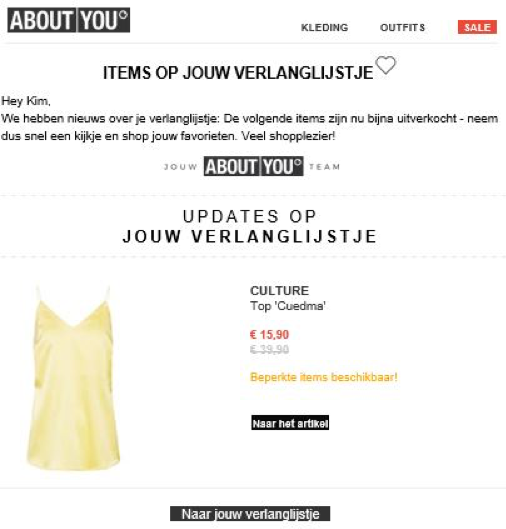 Voorbeeld van schaarste: op de website van About You kan je leuke items in een verlanglijst zetten voor later. In de e-mail werd daar slim gebruik van gemaakt, door die items in de nieuwsbrief te tonen in combinatie met het principe schaarste.