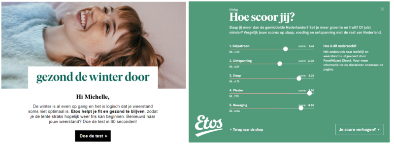 Voorbeeld van consistentie: hier zie je de e-mail die Etos stuurde met de button naar de vragenlijst. Je vult de vijf lekker korte vragen in en krijgt een handig overzicht van de factoren die invloed hebben op je weerstand. Vervolgens kan je de score onderin verhogen en krijg je aanbevolen producten.