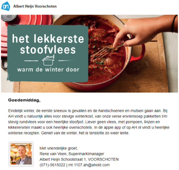 Voorbeeld van sympathie: Albert Heijn pakt het slim aan door e-mails te versturen vanuit een filiaal in jouw buurt en in de afsluiting van de e-mail de naam en foto van de manager van dat filiaal te tonen. N.B.: niet de aanhef, maar de onderwerpregel was in deze e-mail gepersonaliseerd met mijn voornaam.