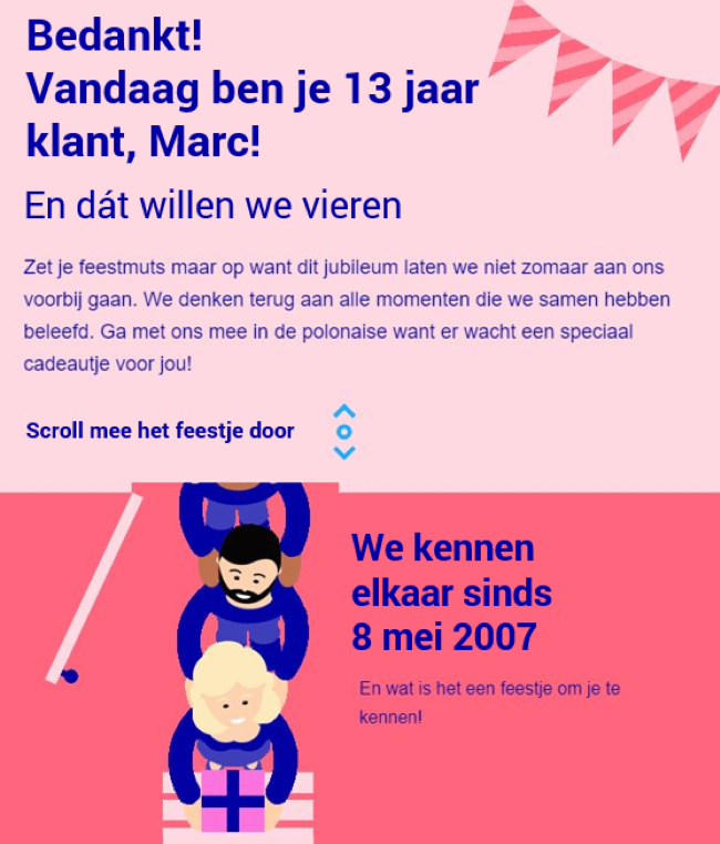 Voorbeeld van wederkerigheid: Bol.com stuurde klanten een grappige e-mail met dansende mensen om te vieren dat je al zo lang klant was. Er werd data ingeladen over je onder andere eerste besteldatum, favoriete product en populairste shopcategorie. Onderaan de e-mail kreeg je ook een cadeautje.