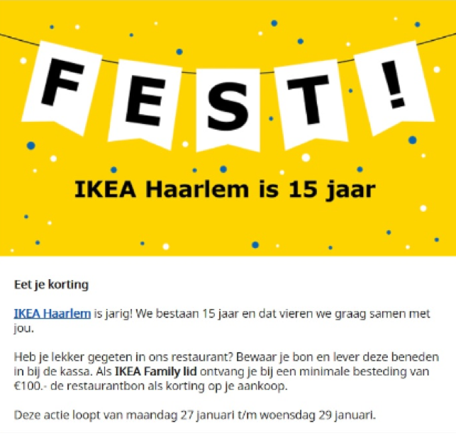 Voorbeeld van eenheid: Ikea was in deze e-mail in voor een familiefeestje en wilde dat graag met ons vieren door heel haar Family een leuk cadeau te geven.