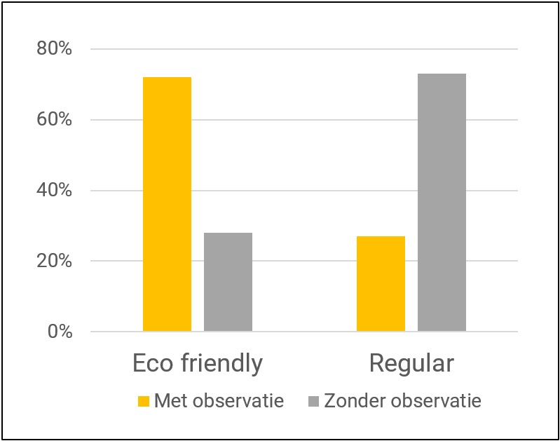 Duurzame claims leiden niet altijd tot productvoorkeur. In een experiment met een fictief ontsmettingsmiddel kregen deelnemers keuze uit twee varianten: Up & Up Green (Eco friendly) en Up & Up White (Regular). Wat bleek? Als een observant aanwezig was, kozen de meeste deelnemers het duurzame Up & Up Green. Was deze afwezig, dan werd massaal gekozen voor de regular Up & Up White. Blijkbaar is duurzaamheid niet altijd een pluspunt en speelt sociale wenselijkheid een belangrijke rol.