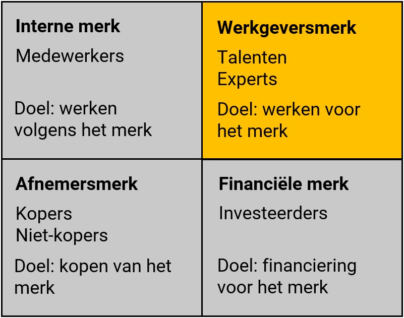 Het merk speelt als werkgeversmerk een belangrijke rol bij het aantrekken van nieuwe medewerkers. Employer branding en de employee experience zijn onderwerpen die de laatste jaren steeds meer aandacht krijgen door de toenemende schaarste op de arbeidsmarkt. De war on talent woedt in alle hevigheid en het merk is een van de middelen die aan dit front wordt ingezet.