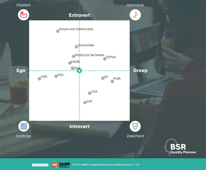 Op basis van dit onderzoek weten we hoe het associatienetwerk van eigenschappen/waarden er voor elke gemeten partij uitziet. Als we de partijen plotten in het BSR-model – door de ‘psychologische as’ (extravert versus introvert) en de ‘sociologische as’ (ego versus groep) te laten kruisen ontstaan vier segmenten – liggen deze verspreid over de vier kwadranten. De partijen lijken helemaal niet op elkaar, verschillen juist behoorlijk in de perceptie van het publiek (de variatie is veel groter dan bij bijvoorbeeld de merken van verzekeringmaatschappijen). Ook opvallend: de PvdA en GroenLinks liggen behoorlijk ver uiteen; samenwerking ‘op links’ is mede daarom niet vanzelfsprekend.