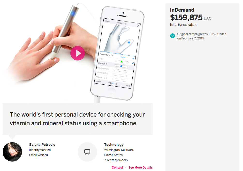 Vitastiq is in februari 2015 op Indiegogo gefinancierd, één van de grootste crowdfundingplatforms ter wereld. Met een eenvoudige meetpen aangesloten op de audio-in- en uitgang van je smartphone meet de mobiele app van Vitastiq via de meridianen dertig essentiële vitaminen en mineralen in het lichaam: biotine, calcium, chroom, co-enzym Q10, foliumzuur, galzuren, glucosamine, hemoglobine, ijzer, jodium, kalium, koper, magnesium, mangaan, natrium, omega 3-6, pepsine, proteïnen, selenium, vitamine A, vitamine B1, vitamine B2, vitamine B3, vitamine B5, vitamine B6, vitamine B12, vitamine C, vitamine D, vitamine E en zink (ik denk: ik noem ze allemaal maar). Wie zich wel eens heeft verdiept in gezondheid, voeding of effecten van stress zal direct de relevantie hiervan inzien. Daarom kan dit instrument zich goed aansluiten in de quantified-selfkaravaan.