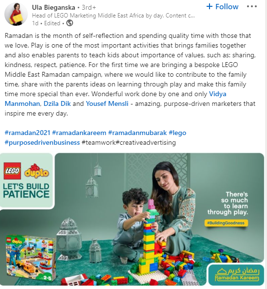 Lego gaat voor het eerst een speciale campagne voeren. Voor de eerste keer brengt het merk een op maat gemaakte Lego Middle East Ramadan-campagne, waarbij het graag een bijdrage wil leveren aan de tijd voor het gezin, ideeën over leren door te spelen met de ouders willen delen en deze gezinsperiode speciaal maken.