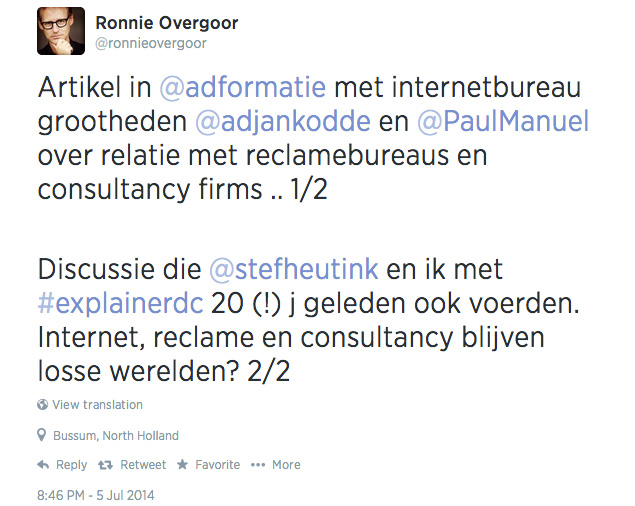 Dit weekend werd ik door mijn oud-businesspartner Ronnie Overgoor gewezen op een interview in Adformatie met 2 ouwe digitale rotten, Adjan Kodde van Mirabeau en Paul Manuel van Tam Tam. Ronnie twitterde dat wij de in het artikel gevoerde discussie over de gescheiden werelden van reclame, consultancy en internet 20 jaar geleden al voerden. Mijn reactie: reclame en internet zijn onverenigbaar. Ik heb het aan den lijve ondervonden.