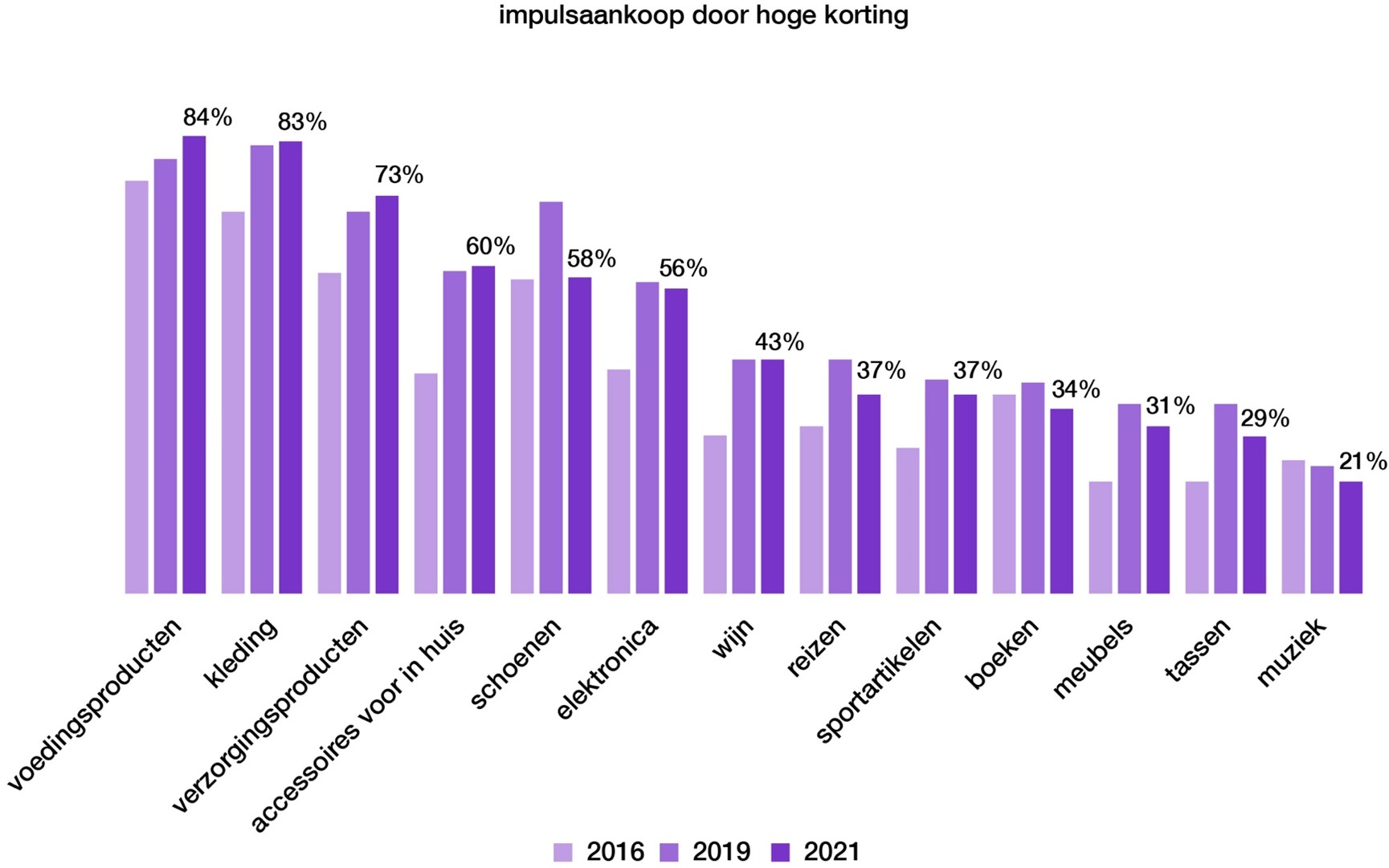 Terug naar het onderzoek van Reclamefolder.nl (en weeg zelf de betrouwbaarheid van de bron maar): “Het aantal consumenten dat ‘toegeeft’ op zoek te gaan naar korting is tevens gestegen. Met name de jongere doelgroep geeft aan actief op zoek te gaan naar korting, terwijl ze het product waarvoor de korting geldt eigenlijk niet nodig hebben. Bij een korting van ongeveer veertig procent komen de meeste mensen in de verleiding. Wat in de onderzoeksresultaten verder opvalt, is dat vooral op voedingsgebied het aantal impulsaankopen is gestegen. Dit in tegenstelling tot schoenen, reizen, boeken, meubels en tassen waarbij het aantal impulsaankopen in de laatste vijf jaar is gedaald. Vrouwen komen vaker in de verleiding om dit soort impulsaankopen te doen dan mannen.”