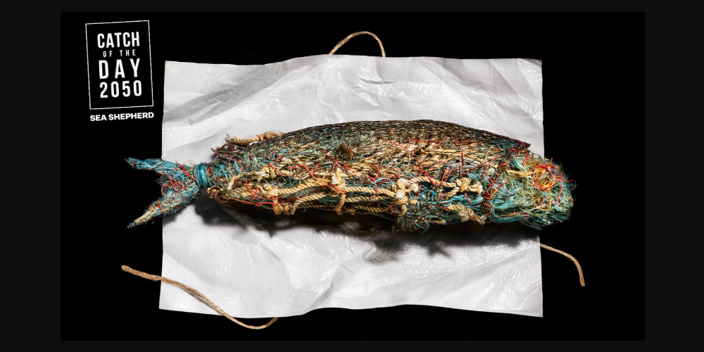 Uit het persbericht: Als overbevissing aanhoudt, zal er in 2050 meer zeeafval, zoals visnetten en ander visgerei, dan daadwerkelijke vis rondzwemmen in onze oceanen. Om dit bewustzijn te vergroten en onmiddellijke actie om de oceaan te redden te promoten, werkte Sea Shepherd samen met Ogilvy Social.Lab om de unieke campagne Catch Of The Day 2050 te lanceren – het tonen van vissen en schaaldieren gemaakt van in de Noordzee gevonden visnetten.