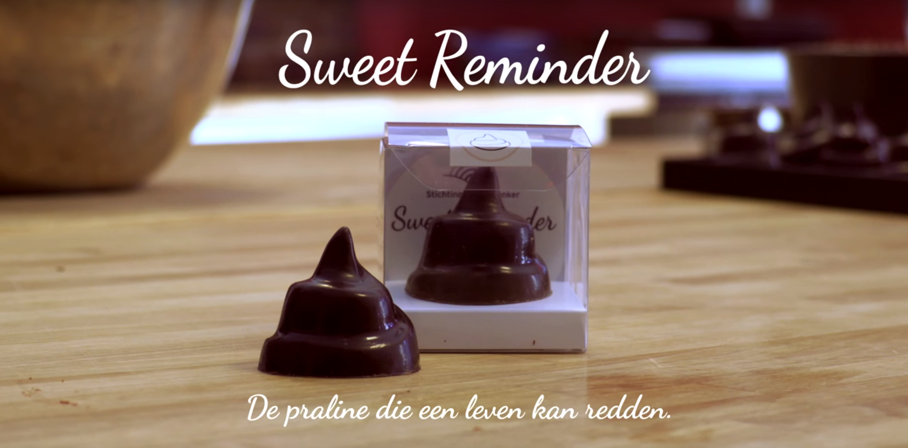 Laurent Gerbaud heeft de Sweet Reminder-praline exclusief voor de Stichting tegen Kanker ontworpen. Een heerlijke zwarte chocolade van 70 procent cacao, gevuld met een ganache van pruimen. Zo kan je je naasten die ouder zijn dan 56, op een zoete manier eraan herinneren deel te nemen aan het bevolkingsonderzoek naar darmkanker.