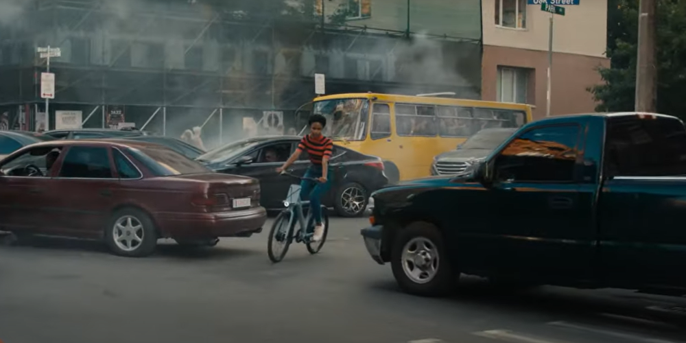 “Vanuit het rumoer van de stad komt triomfantelijk een fietser tevoorschijn. Zij baant zich soepel een weg door de verkeersopstopping, terwijl de auto’s en hun bestuurders om haar heen symbolisch in de tijd terugkeren.”