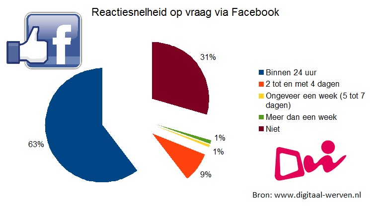 Ook de snelheid van de reacties neemt toe. Van alle vragen is 63 procent binnen een dag beantwoord. Als de niet beantwoorde vragen niet meegenomen worden, komt 90 procent van het aantal antwoorden binnen een dag. In 2013 was dit 65 procent van alle antwoorden. Je zou dus bijna kunnen stellen dat als een vraag via Facebook niet binnen 24 uur beantwoord wordt, de kans minimaal is (10 procent) dat hij nog ooit beantwoord wordt.