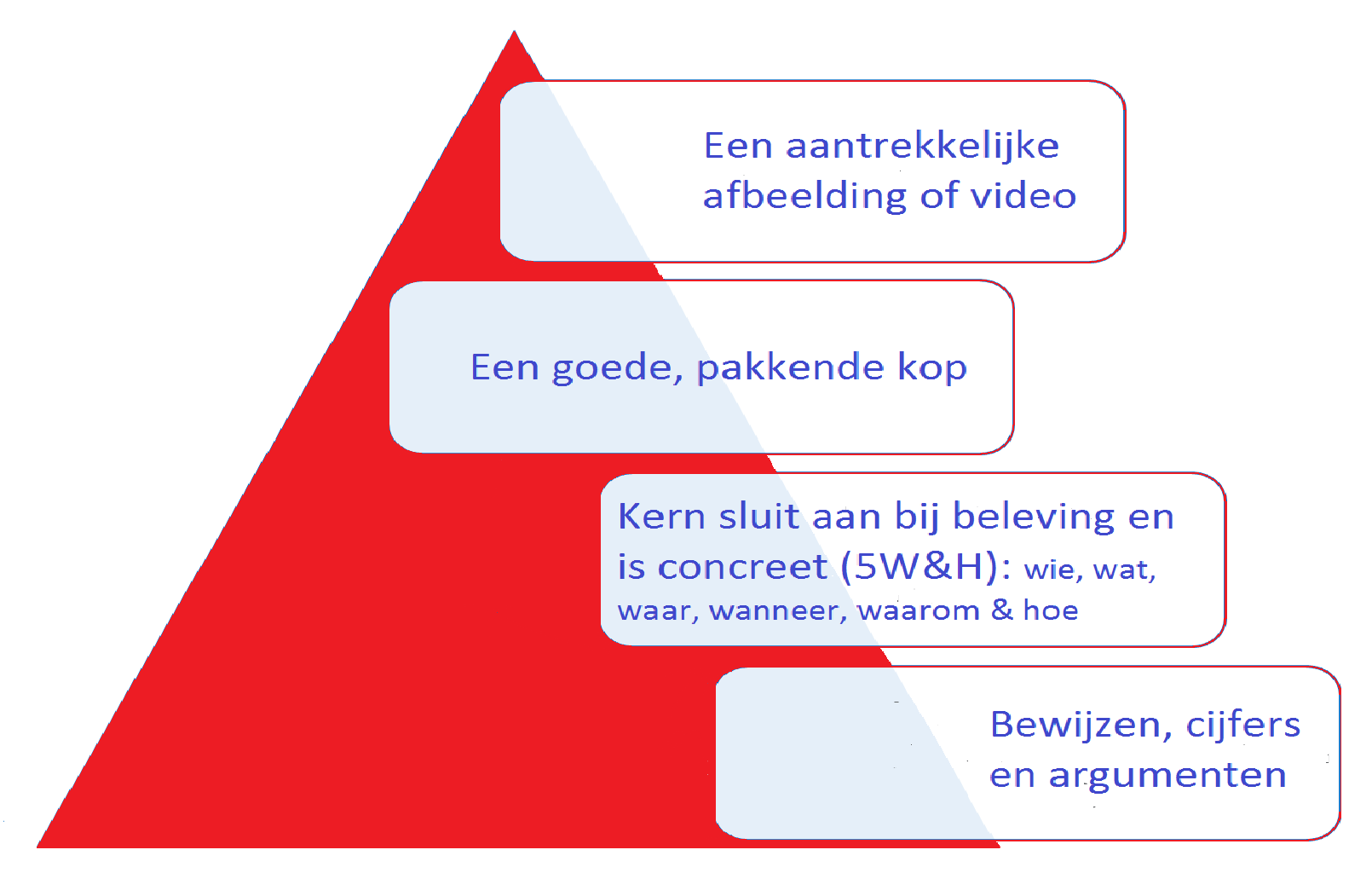Als je het mij vraagt zijn dan dezelfde stappen als bij de productie van content, maar dan in omgekeerde volgorde. Hij of zij start bij de afbeelding of het openen van de video. Want beeld verwerken de hersenen duizend keer sneller dan tekst. De volgende ‘stop’ is de kop of intro van de video of het artikel. Pas als de aandacht is getrokken leest of kijkt men verder. En zo komt het dat veel content nog geen seconde aandacht krijgt, want ze komen niet voorbij de afbeelding. De volgorde waarin content wordt gescand is hieronder weergegeven.