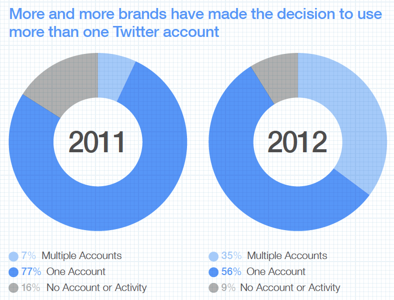 Het aantal merken dat meerdere accounts gebruikt op Twitter is ten opzichte van 2011 fors toegenomen, van 7% naar 35%. Hamvraag daarbij blijft of het gebruik van meerdere accounts echt extern ingegeven wordt, bijv. vanwege een sterk onderscheidende doelgroep, of meer intern in de zin van: “Afdeling X is succesvol op Twitter dan moeten wij met afdeling Y ook een eigen account en aan de slag”. Overigens niks mis met meerdere Twitter-accounts voor bedrijven, alleen als het niet extern ingegeven wordt, is het verre van optimaal en kost het extra veel moeite het tot een succes te maken.