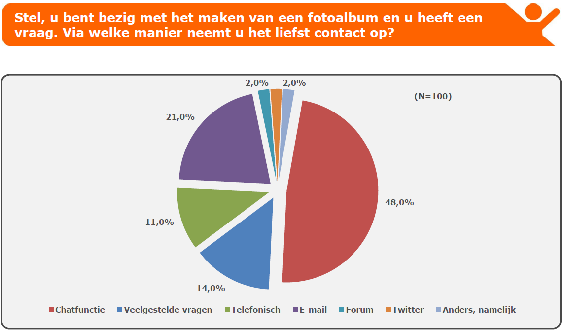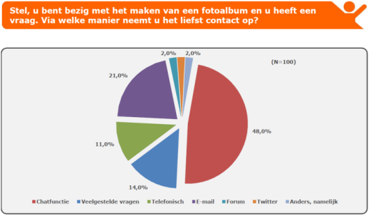 Nogmaals: er zijn nogal wat keuzes te maken tijdens het ontwerpen van een fotoalbum. Veel mensen zullen tijdens het proces tegen de nodige vragen en problemen aanlopen. Daarom vroeg WUA! haar respondenten specifiek naar de manier waarop zij het liefst door de aanbieder geholpen worden. Maar liefst 48% heeft het liefst een chatfunctie tot zijn of haar beschikking. Op afstand volgen de hulp via e-mail (21%), de veelgestelde vragen (14%) en de telefoon (11%).