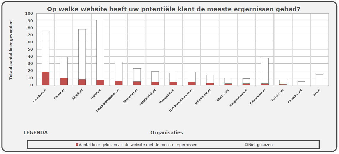 Allereerst, terugkomend op de bestelmethode, biedt Kruidvat alleen een software-installatie aan. Maar er is meer aan de hand. Kruidvat.nl wordt van alle aanbieders het vaakst aangewezen als website waarop de meeste ergernissen worden beleefd. 17% van de bezoekers haakt na de eerste indruk al direct af. Bij de specifieke thema's waarop websites door respondenten worden beoordeeld, valt ondere andere op dat Kruidvat teleurstelt qua Vormgeving en Gebruiksvriendelijkheid. Op beide onderdelen staat Kruivat.nl op de veertiende plaats op de ranglijst.