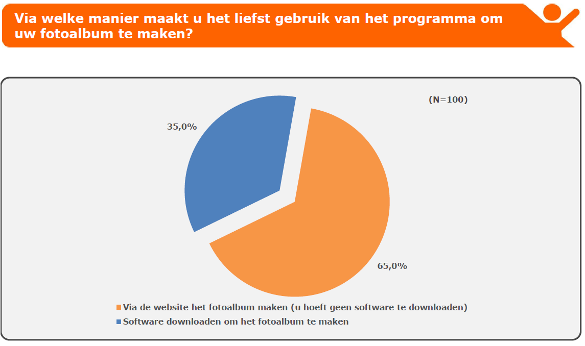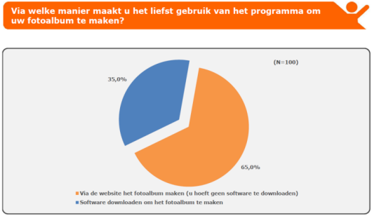 Gevraagd naar de voorkeur geeft 65% aan het liefst te werken met een module op de website zelf. Deze ruime meerderheid is direct terug te zien in de voorkeur die respondenten uitspreken na anderhalf uur oriënteren. Albelli en HEMA bieden beide de keuze aan tussen software en een online module. Albelli wordt uiteindelijk door 22% van de respondenten als favoriet aangewezen; HEMA door 18%. Op behoorlijke afstand volgt vervolgens Fotoalbum.nl met 7% van de voorkeur. Hier is alleen met te downloaden software te werken.