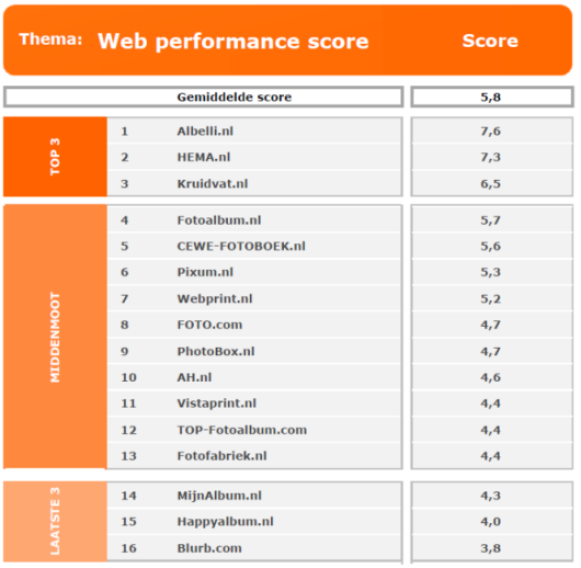 Een website die een eervolle vermelding verdient, is Fotoalbum.nl. De website staat op de derde plaats wat voorkeur betreft, maar de potentie is wellicht groter, zo suggereren de rapportcijfers. Fotoalbum.nl behaalt de eerste plaats op het thema Gebruiksvriendelijkheid en staat tweede qua Informatiewaarde, Vormgeving en Doorgaan (gaat de respondent op de website door na de eerste indruk?).