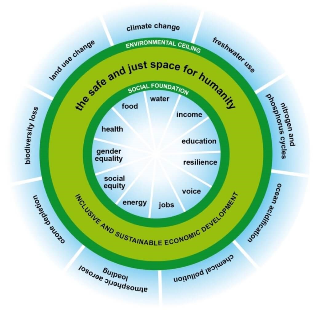 “Econoom Kate Raworth ontwikkelde het model voor Doughnut Economics: een economisch model dat economische welvaart meet door te kijken naar de realisatie van een sociaal fundament zonder het overschrijden van ecologische plafonds. Simpel gezegd is het doel om de behoeftes van iedereen te realiseren binnen de draagkracht van de Aarde. Het gat van het model geeft weer hoeveel mensen geen toegang hebben tot basisbenodigdheden als gezondheidszorg, onderwijs en huisvesting. De korst geeft weer in hoeverre de ecologische plafonds, waarvan leven afhankelijk is, worden overschreden. Volgens het model is een economie welvarend als alle twaalf elementen van het sociale fundament worden gehaald zonder een ecologisch plafond te overschrijden. Deze situatie wordt in het model beschreven als ‘de veilige en rechtvaardige ruimte voor de mensheid’.”