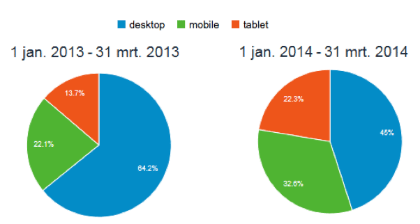 Hoewel het langzamer gaat dan sommige marketinggoeroes beweren, blijft het aandeel van internetten met tablets en smartphones continu stijgen. Bij Adfactor zien we de statistieken van honderden blogs en de verschuiving van desktop naar tablet en mobiel is daar indrukwekkend. Zo is het aandeel mobiel (tablets en smartphones samen) in het segment ‘food’ in één jaar tijd gegroeid van 35,8 procent naar 54,9 procent.