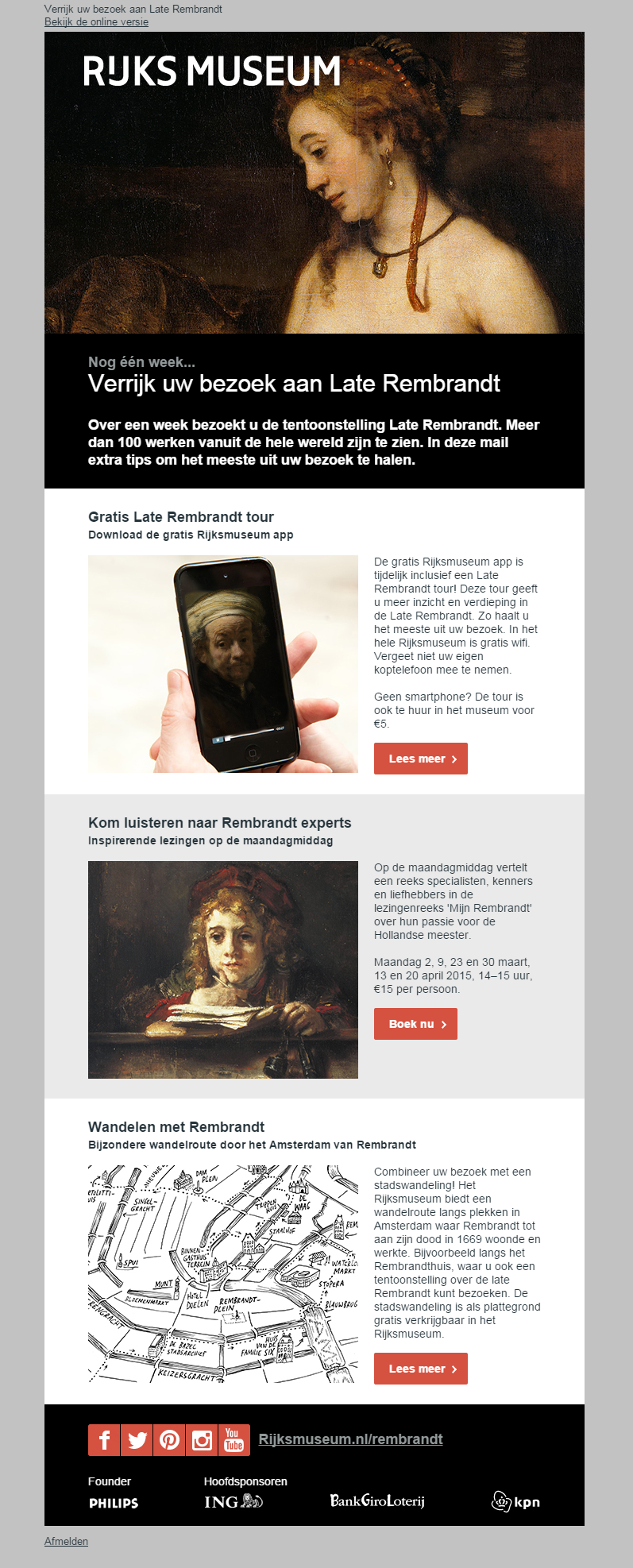 We verzenden dus niet alleen een e-mail met de boodschap ‘bedankt voor uw boeking’, maar sturen twee weken en één week van tevoren nog een e-mailing over activiteiten die het bezoek kunnen verrijken, zoals de gratis te downloaden multimediatour, de Rembrandt-wandelroute door Amsterdam en de familieworkshops. Een dag van tevoren krijgen bezoekers onder andere praktische informatie en de boodschap ‘veel plezier’ toegestuurd. Samen met onze consultant hebben we een aantal goede ‘business rules’ gekoppeld aan deze campagne, om te voorkomen dat het als spam gezien wordt. Als mensen pas één week van tevoren een ticket kopen, vervallen daarom enkele e-mailings. Het is een succes omdat we relevante content en service bieden en cross-sellmogelijkheden aangrijpen.