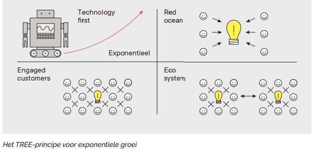 Waar men vooral blind voor is, is wat Vera het TREE-principe noemt. “Vier factoren die exponentieel en eigen zijn aan de succesvolle modellen, waarbij klanten massaal overstappen naar die andere wereld. Technologie eerst, een Rode Oceaan, Engagement van de klant en een Ecosysteem. Elk bedrijf kan dat vertalen naar zijn eigen context.”